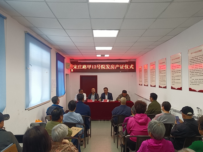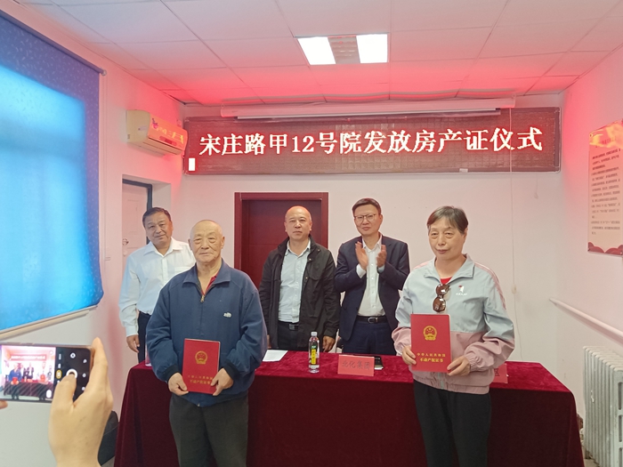 4月25日上午,東鐵匠營街道第二社區(qū)會(huì)議室門前被一團(tuán)喜慶氣氛所環(huán)繞。宋莊路甲12號(hào)院的54戶住戶接過期盼已久的房產(chǎn)證,每個(gè)人的臉上都洋溢著幸福的喜悅。此時(shí),化工廠“宋莊路甲12號(hào)院發(fā)放房產(chǎn)證儀式”正在這里舉行。