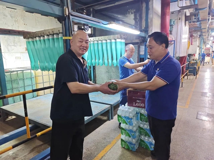 就在“職工之家”開放之際,一份清涼也送到了職工手中。近日,華騰橡塑領(lǐng)導(dǎo)專程來到瑞京公司生產(chǎn)一線,向在酷暑中仍然奮戰(zhàn)在一線的干部職工送上清涼飲品和爽口西瓜,并對(duì)大家表示慰問,叮囑大家要做好防暑降溫工作。
