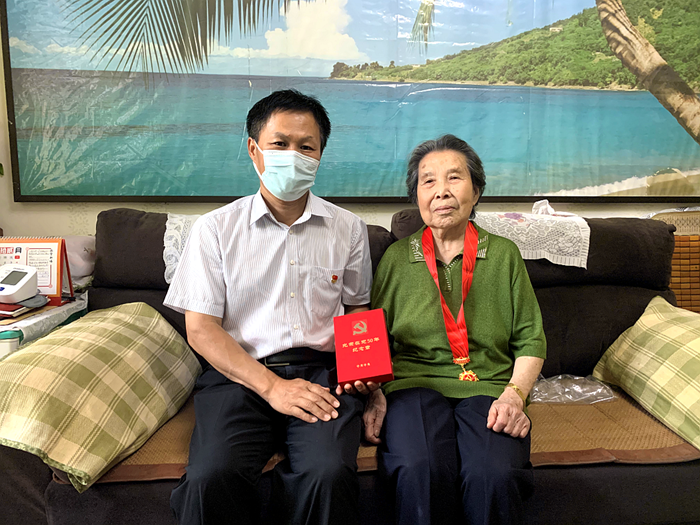 7月1日下午,在中國(guó)共產(chǎn)黨成立101周年之際,受北京化工集團(tuán)黨委委托,黨委副書記吳瑞峰帶隊(duì)來到離休干部孫華云家中,向她頒發(fā)“光榮在黨50年”紀(jì)念章。孫華云同志今年已91歲高齡,1946年9月1日參加工作,1972年7月1日入黨,是集團(tuán)原合纖廠工會(huì)干部。