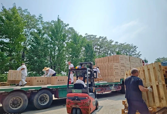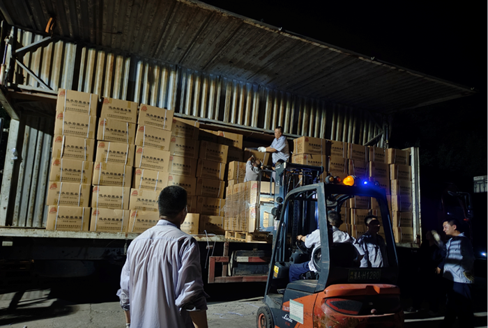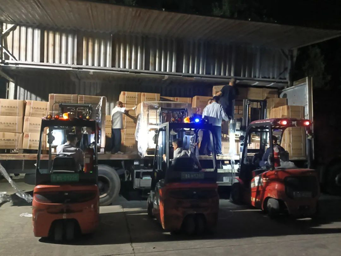 華騰化工立即調度人力、物力,爭分奪秒組織應急物資配送。歷經5個多小時不間歇備貨、裝載,滿載應急物資的4輛大貨車陸續發車,前往抗汛一線。