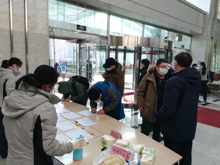 早上8:10,各崗位人員按照前一天下午預案推演的分工,各就各位,各司其職,等待著入樓辦公人員高峰的到來。大廈員工身著工裝,佩戴手套、口罩和護目鏡,分列于兩個側門入口,有的做好入門信息登記,有的手持測溫儀挨個測體溫,有的在門口引導人員分高層和底層兩個口入樓。