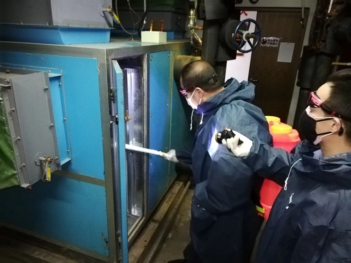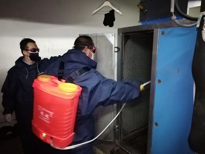 在大廈大堂,公司黨總支書記、總經理、副總經理、運營總監現場協調指導,及時與公司辦公室溝通物資供應,事業部班子成員現場指揮調度,中控操作、樓內保潔消毒、空調消毒、客戶服務等各方面工作緊張有序推進。