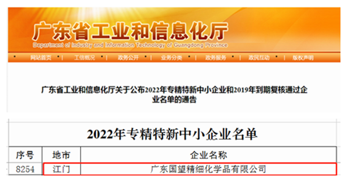 春節(jié)前夕,從廣東傳來好消息,華騰新材所屬廣東國(guó)望精細(xì)化學(xué)品有限公司成功入選廣東省2022年“專精特新”中小企業(yè)名單,成為北京化工集團(tuán)第6家“專精特新”企業(yè)。